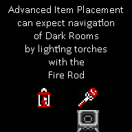 Advanced Item Placement can expect navigation of Dark Rooms (alternate image, Saku's Guide) by lighting torches with the Fire Rod instead of relying on the light cone from the Lamp. These rooms specfically include: Hyrule Castle Escape (Dark Cross; one chest (in World States other than Standard) Back of Escape (3 chests)) Eastern Palace (room with two green Eyegores; one holding a key) Palace of Darkness (Dark Basement; two chests). See also: Dark Room Navigation, Hyrule Castle Garage Door, Index Listing |